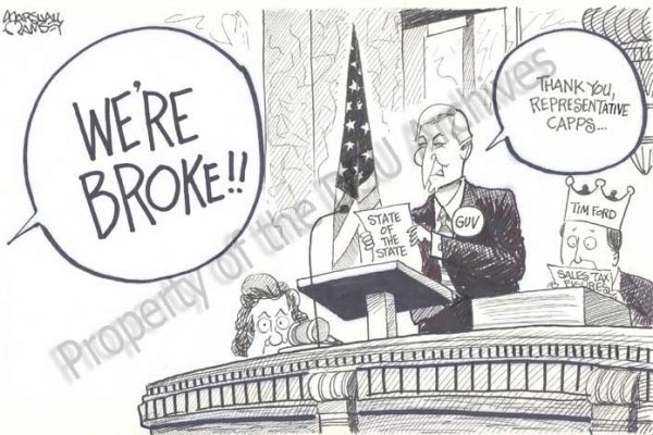 Members of Joint Legislative Budget Committee in new Woolfolk Building — Joint Legislative Budget Committee Room STANDING (L to R): Senator Thomas Gollott, Representive Bobby Moody, Senator Bill Minor, Senator Jack Gordon, Reresentative Diane Peranich, Representative George Flaggs, Senator Hillman Frazier, Representative Billy McCoy, and Senator Ron Farris. SEATED: Representative Charlie Capps, House Speaker Tim Ford, Lt. Governer Amy Tuck, and Senator Travis Little.