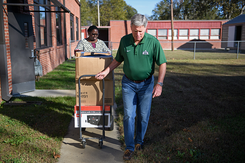 Delta State University President William N. LaForge recently put on his volunteer cap to assist efforts at the St. Gabriel Mercy Center in Mound Bayou.