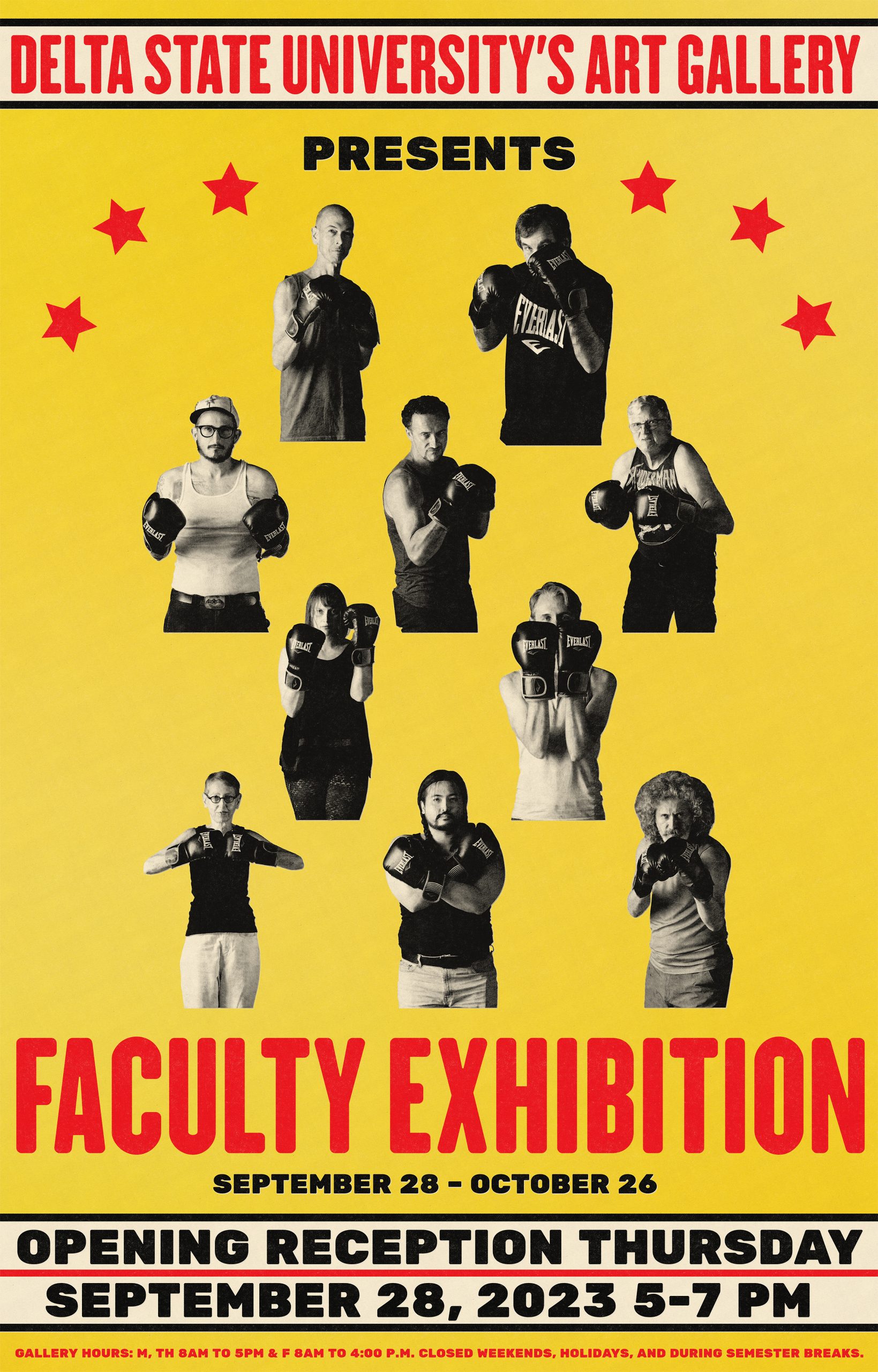 The Annual Faculty Exhibition will be on view in the gallery from September 28 to October 26. The gallery is open Monday through Thursday 8:00 a.m. to 5:00 p.m. and Friday 8:00 a.m. to 4:00 p.m. The gallery is closed on weekends, holidays, and during semester breaks. For further information visit their website at https://www.deltastate.edu/art/wright-center-art-gallery/ or contact 662-846-4720. For updates and announcements of upcoming events follow Delta State Art Department on Facebook.