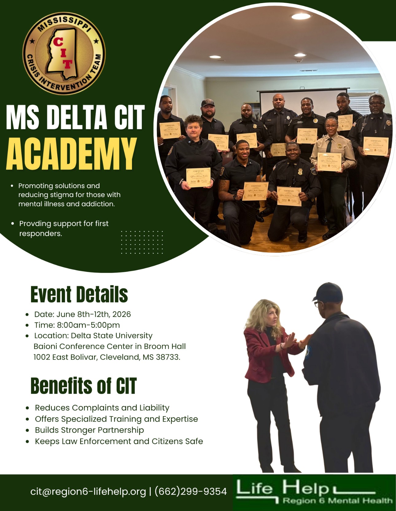 Benefits of the CIT Academy include reducing complaints and liability, offering specialized training and expertise, building stronger partnerships between agencies and communities and helping keep both law enforcement personnel and citizens safe. Additional information about the program and its regional impact is available on their website at region6-lifehelp.org or by calling 662-299-9354.