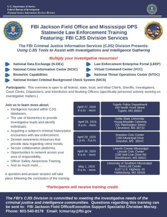 In addition to the CIT Academy, Delta State Police will also serve as a host site for a statewide law enforcement training led by the FBI Jackson Field Office in partnership with the Mississippi Department of Public Safety. The training, titled “Using CJIS Tools to Assist with Investigations and Intelligence Gathering,” will take place on April 28, from 8:00 a.m. to noon at the Young-Maudlin Cafeteria on campus.