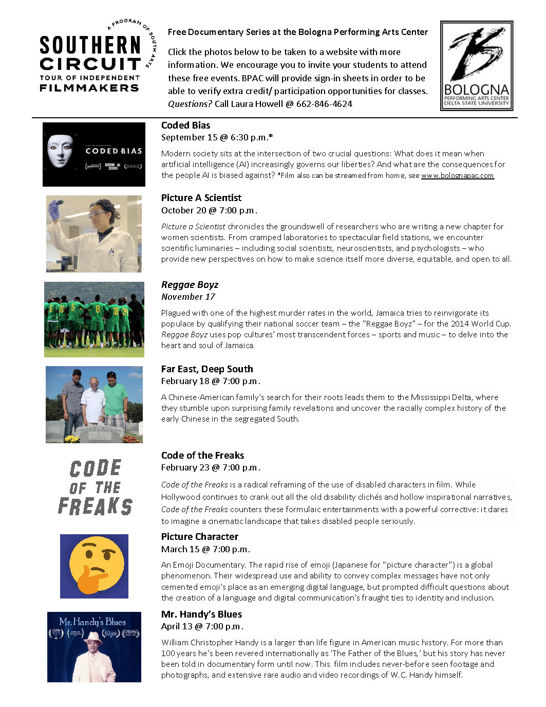 If requested, the BPAC will provide student sign-in sheets to monitor student attendance and would encourage you to consider assigning relevant films to your course. Please contact Laura Howell (lhowell@deltastate.edu) with any questions.