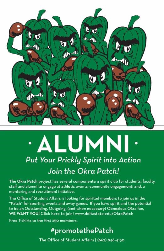 The Office of Student Affairs is looking for spirited members to join us in the “Patch” for athletic events and some away games. If you have spirit and the potential to be an Outstanding, Outgoing, (and when necessary) Obnoxious Okra fan, WE WANT YOU! Visit www.deltastate.edu/OkraPatch to join. Free T-shirts to the first 250 members.