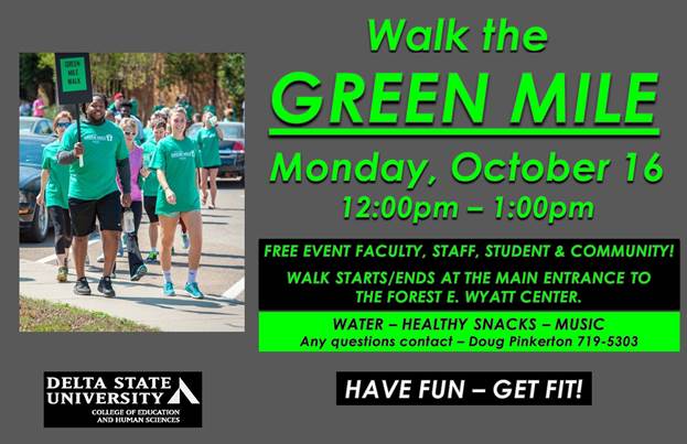 Join the campus and community for another walk around the Green Mile Oct. 16 from noon to 1 p.m. Water, healthy snacks and music will kick off the annual event. For more information, call Doug Pinkerton at 662-719-5303.