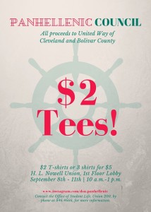Collect your Greek memorabilia Tees for $2 a piece (or 3 shirts for $5) on the 1st Floor Lobby of the H. L. Nowell Union.