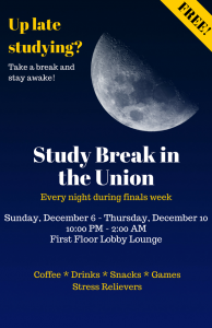 There will be coffee, drinks, snacks, games, and stress relievers every night during finals week in the first floor lobby lounge of the Union.