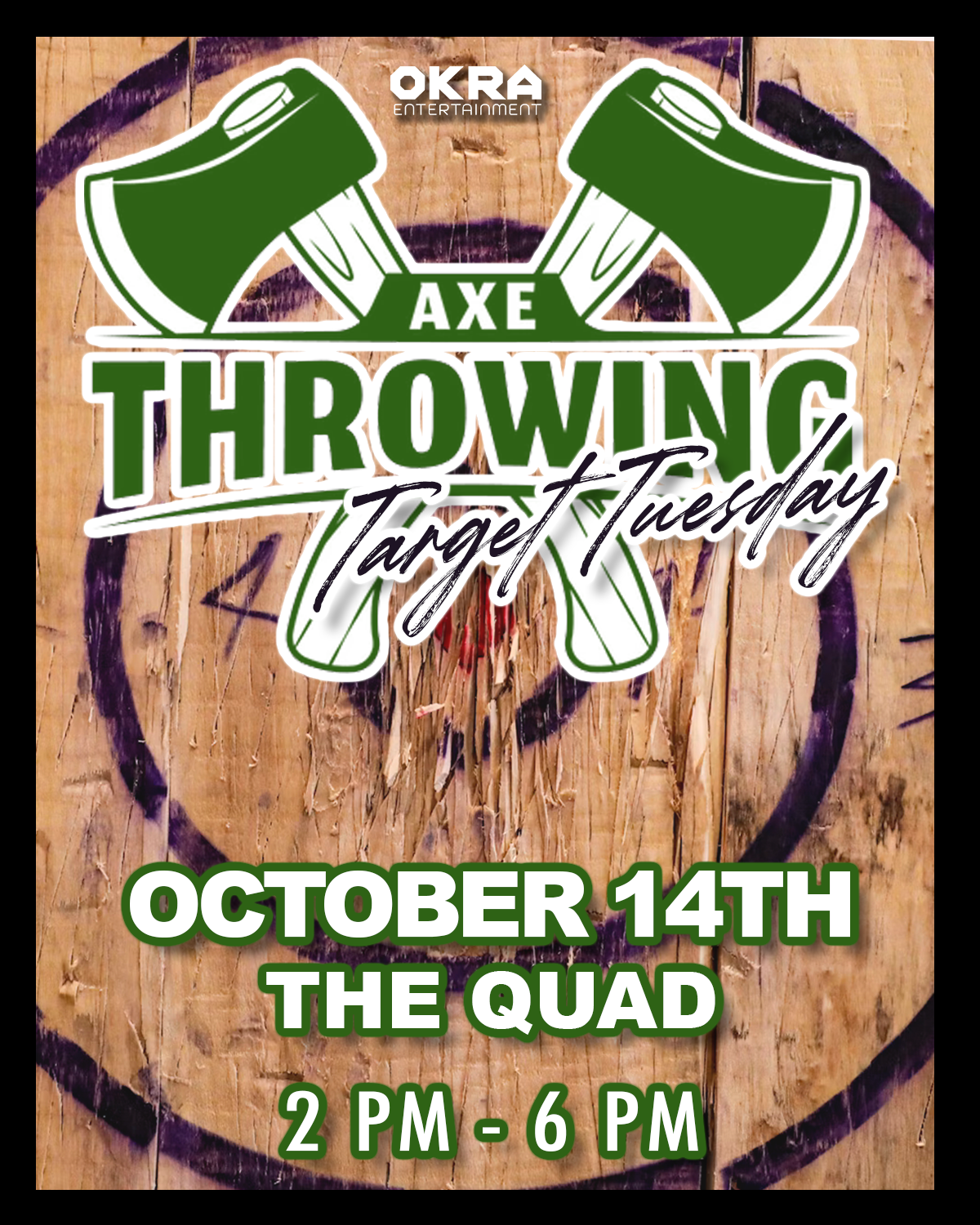 Homecoming week! Yes, actual axe throwing. Come release some stress and hit the mark!