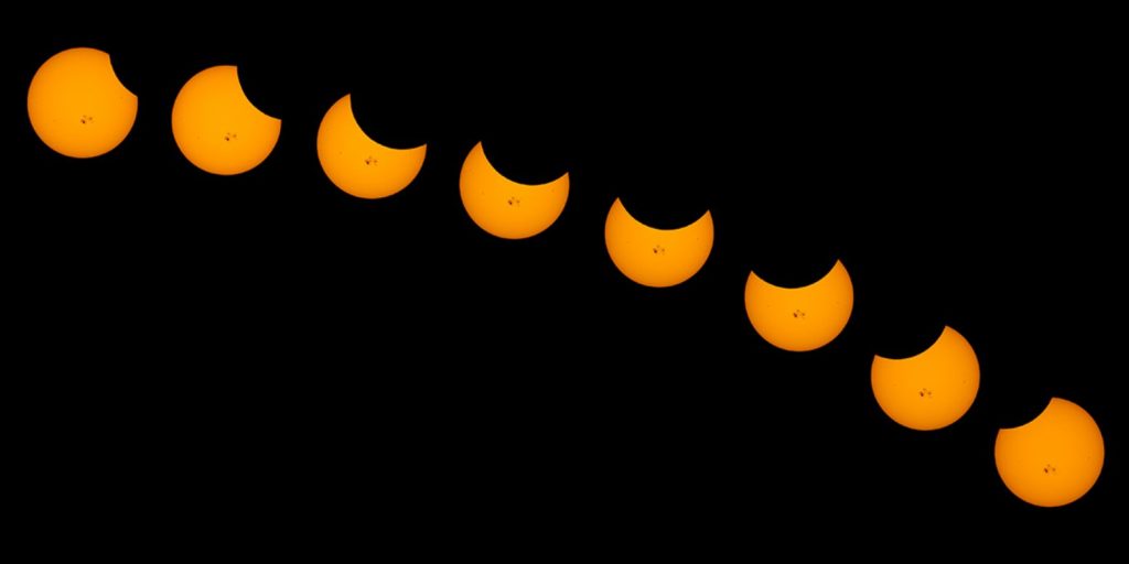 On Saturday October 14, Cleveland will experience a partial solar eclipse. Partial solar eclipses occur when the Moon temporarily covers a portion of the Sun. The partial eclipse begins on October 14 at 10:30AM and ends at 1:30PM, with the Moon blocking the most light (about 65% coverage) at 12:01PM.
